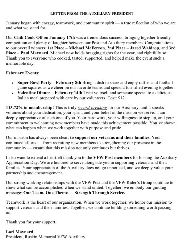 Dear members, auxiliary and friends of Ruskin Memorial VFW Post 6287,